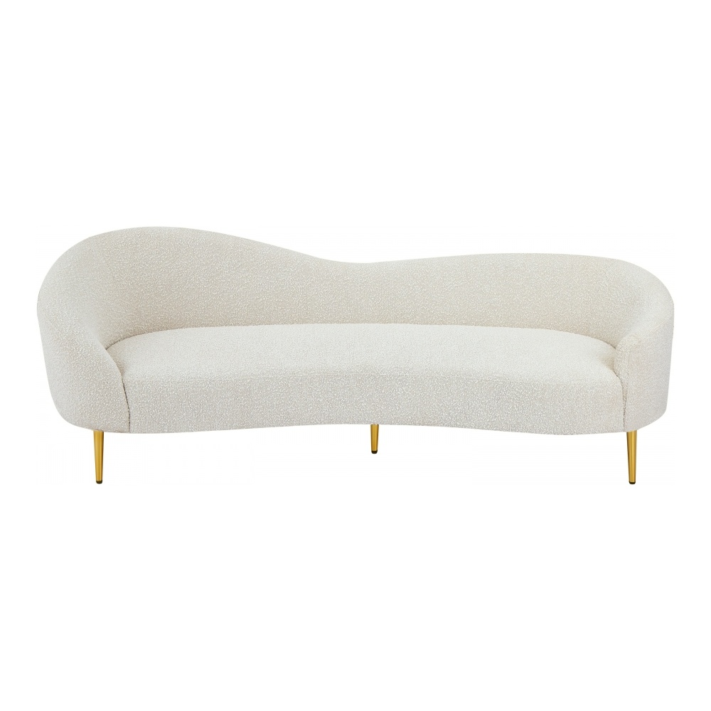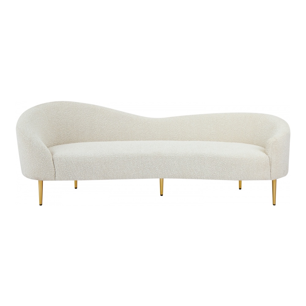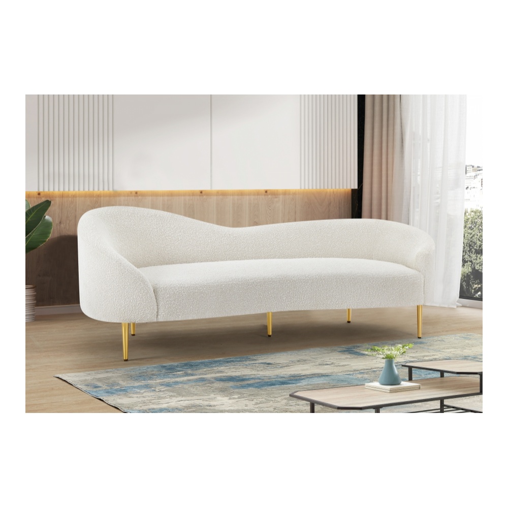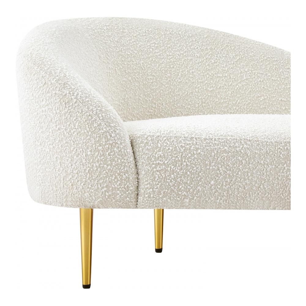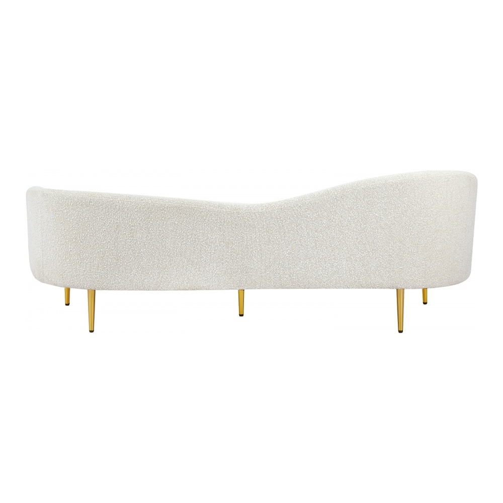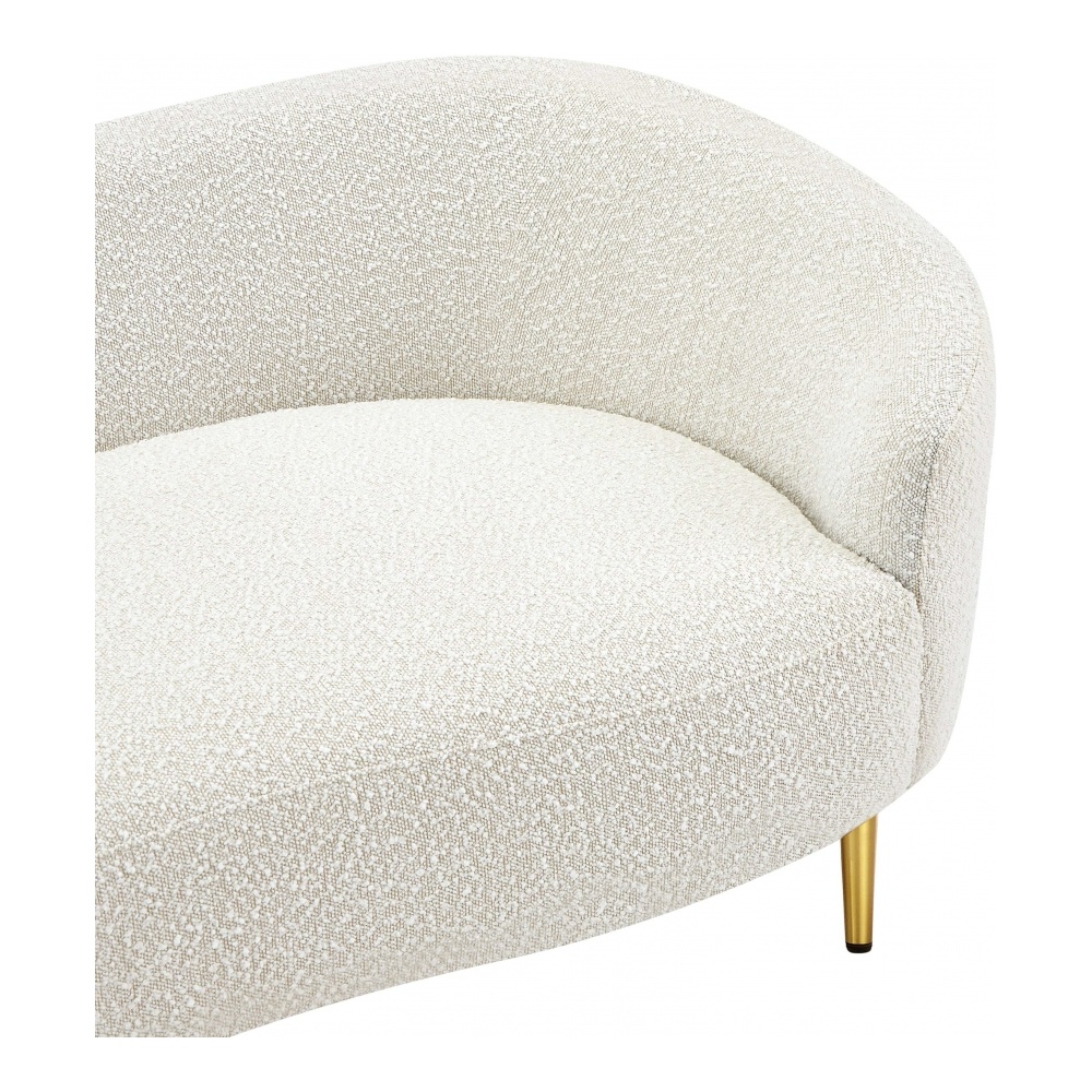 Impress family and guests alike with this Ritz Boucle Fabric Sofa. Wrapped in a cozy cream boucle fabric, this sofa exudes elegance and comfort. The gold metal legs add a touch of glamour to the overall design, making it a perfect addition to any modern living space. Sit back, unwind, and sink into the plush cushions of this chic and stylish sofa.
