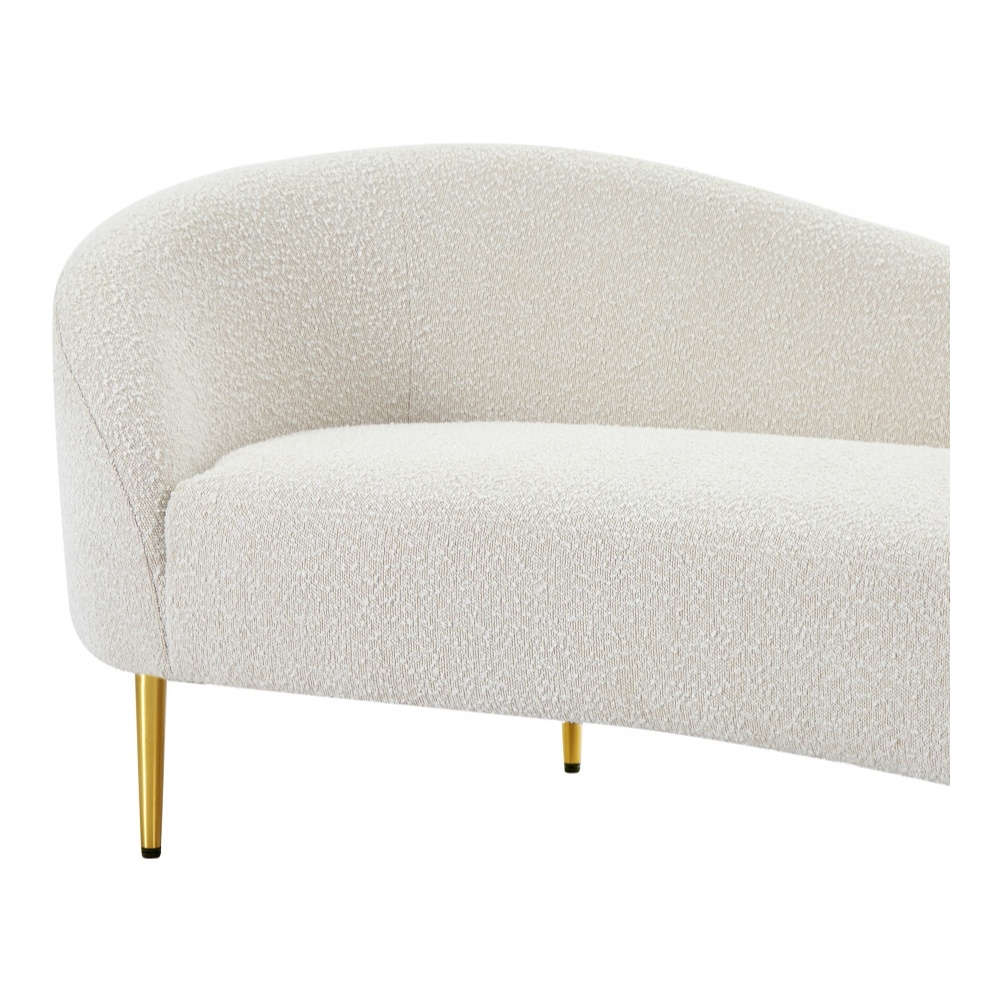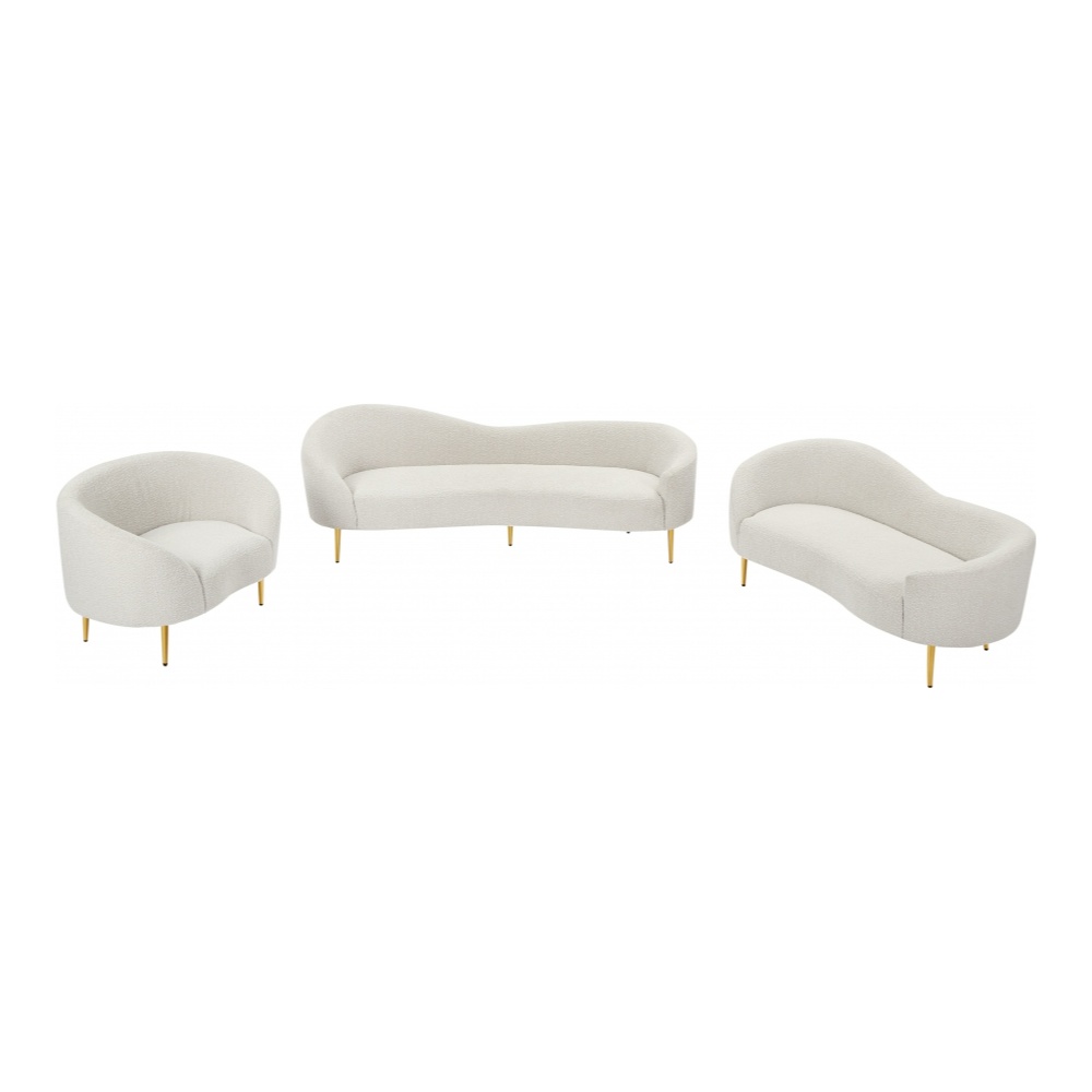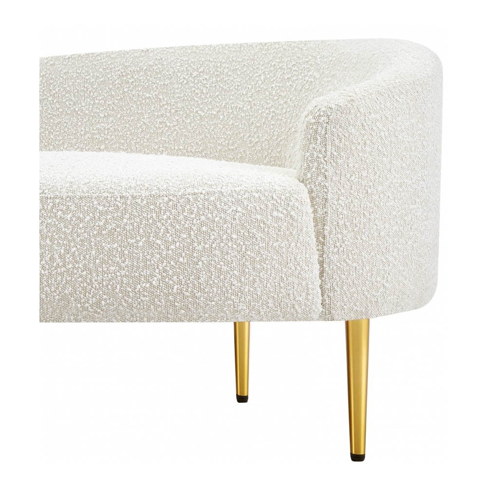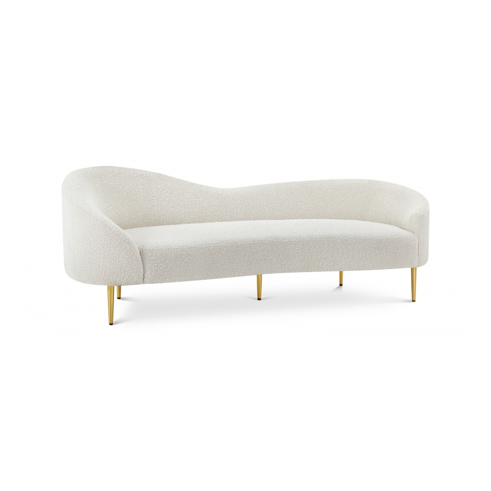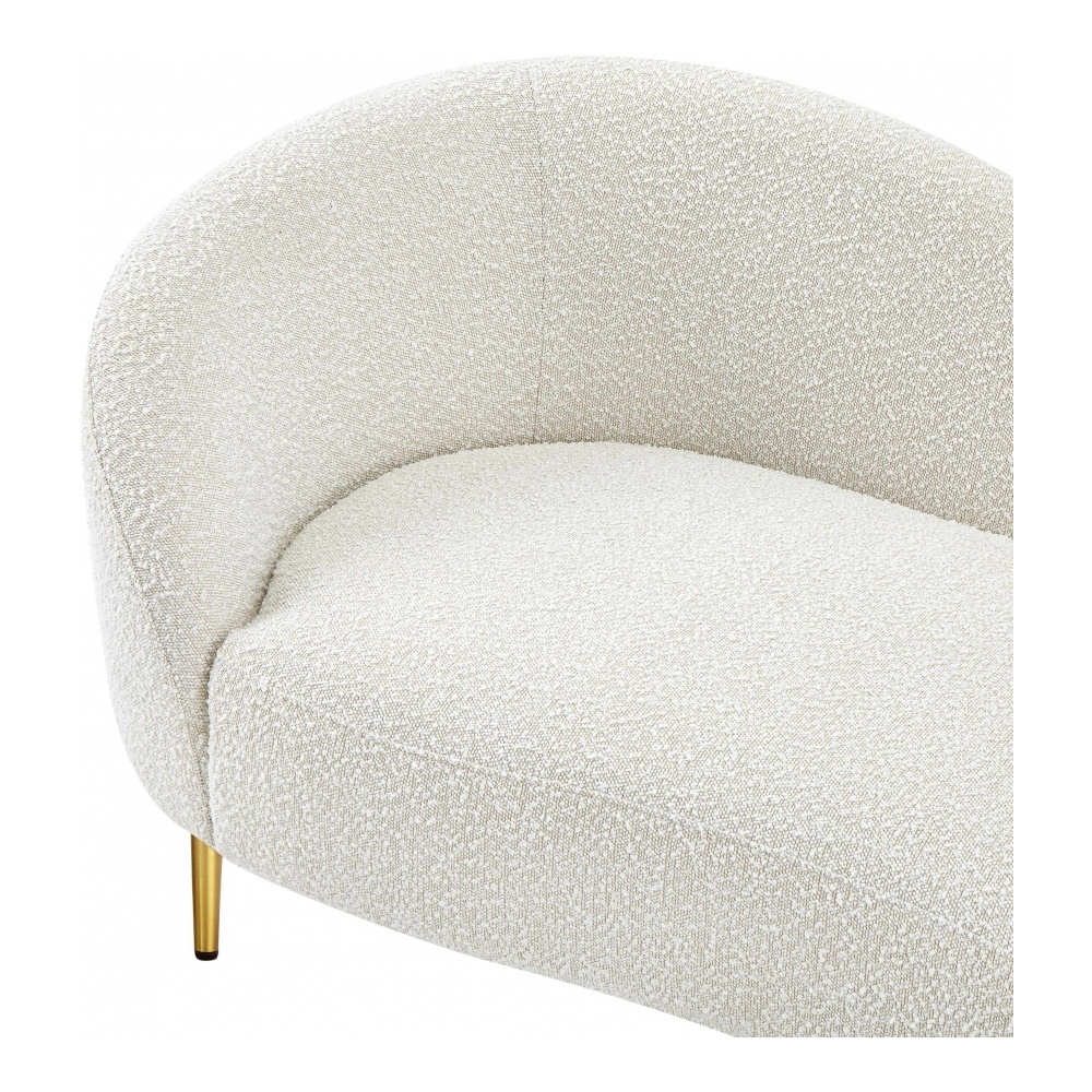 Impress family and guests alike with this Ritz Boucle Fabric Sofa. Wrapped in a cozy cream boucle fabric, this sofa exudes elegance and comfort. The gold metal legs add a touch of glamour to the overall design, making it a perfect addition to any modern living space. Sit back, unwind, and sink into the plush cushions of this chic and stylish sofa.
