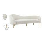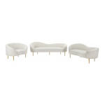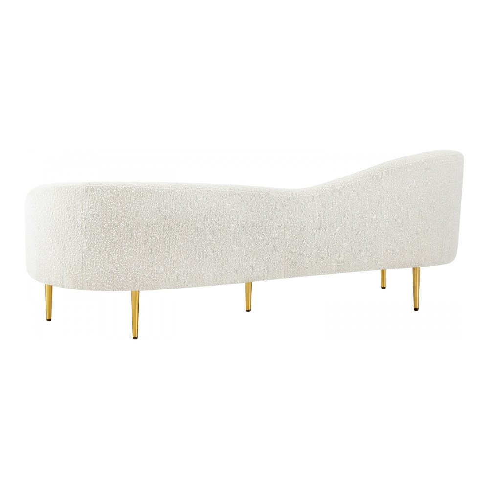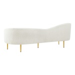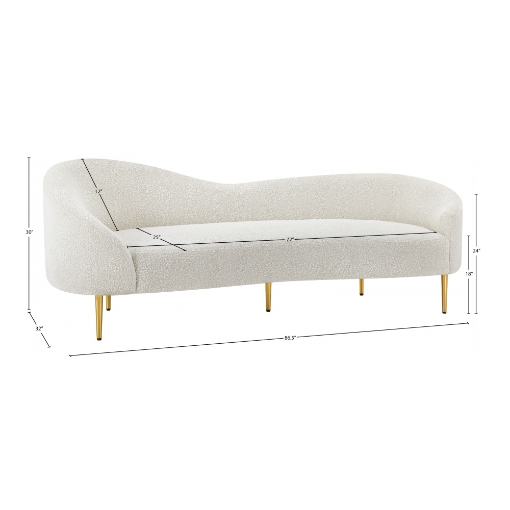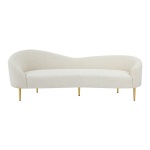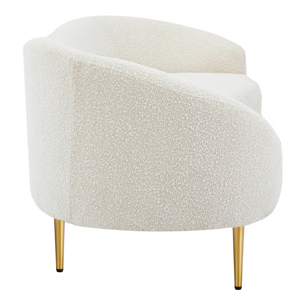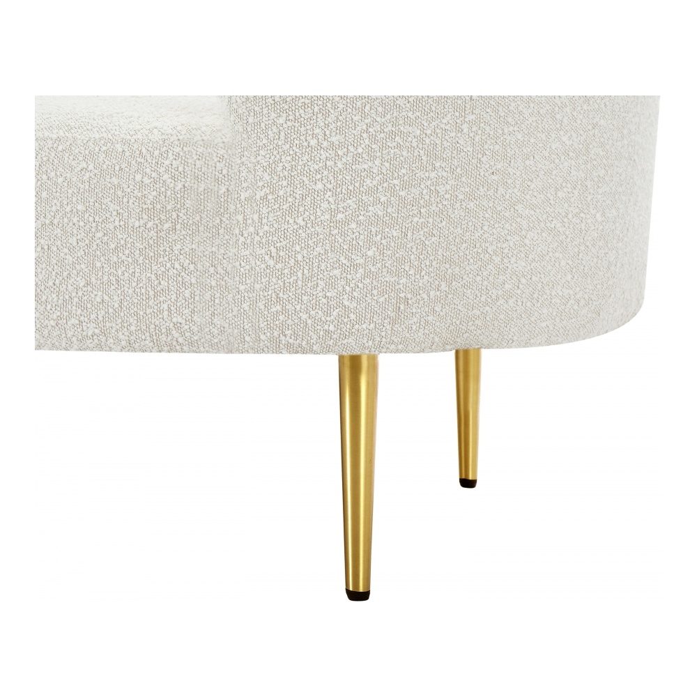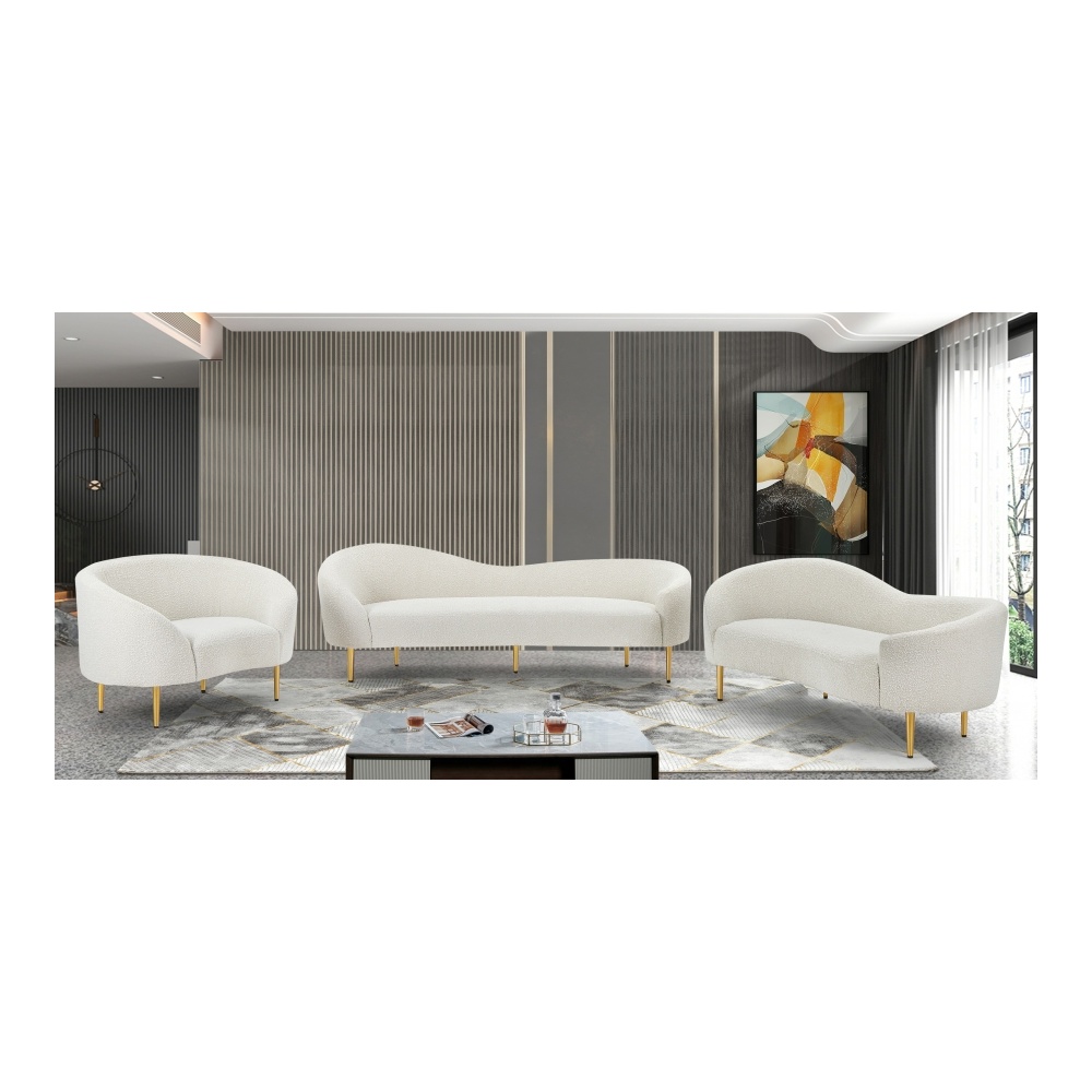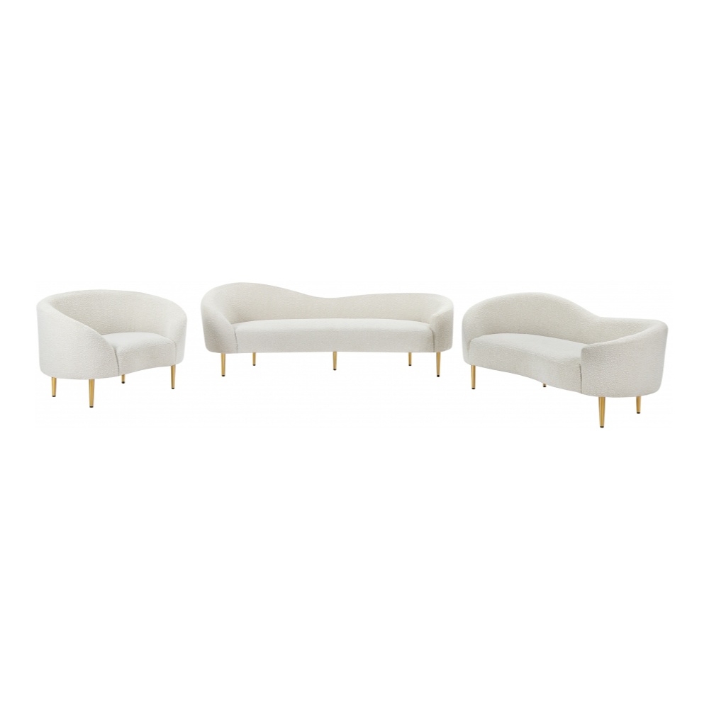 Impress family and guests alike with this Ritz Boucle Fabric Sofa. Wrapped in a cozy cream boucle fabric, this sofa exudes elegance and comfort. The gold metal legs add a touch of glamour to the overall design, making it a perfect addition to any modern living space. Sit back, unwind, and sink into the plush cushions of this chic and stylish sofa.