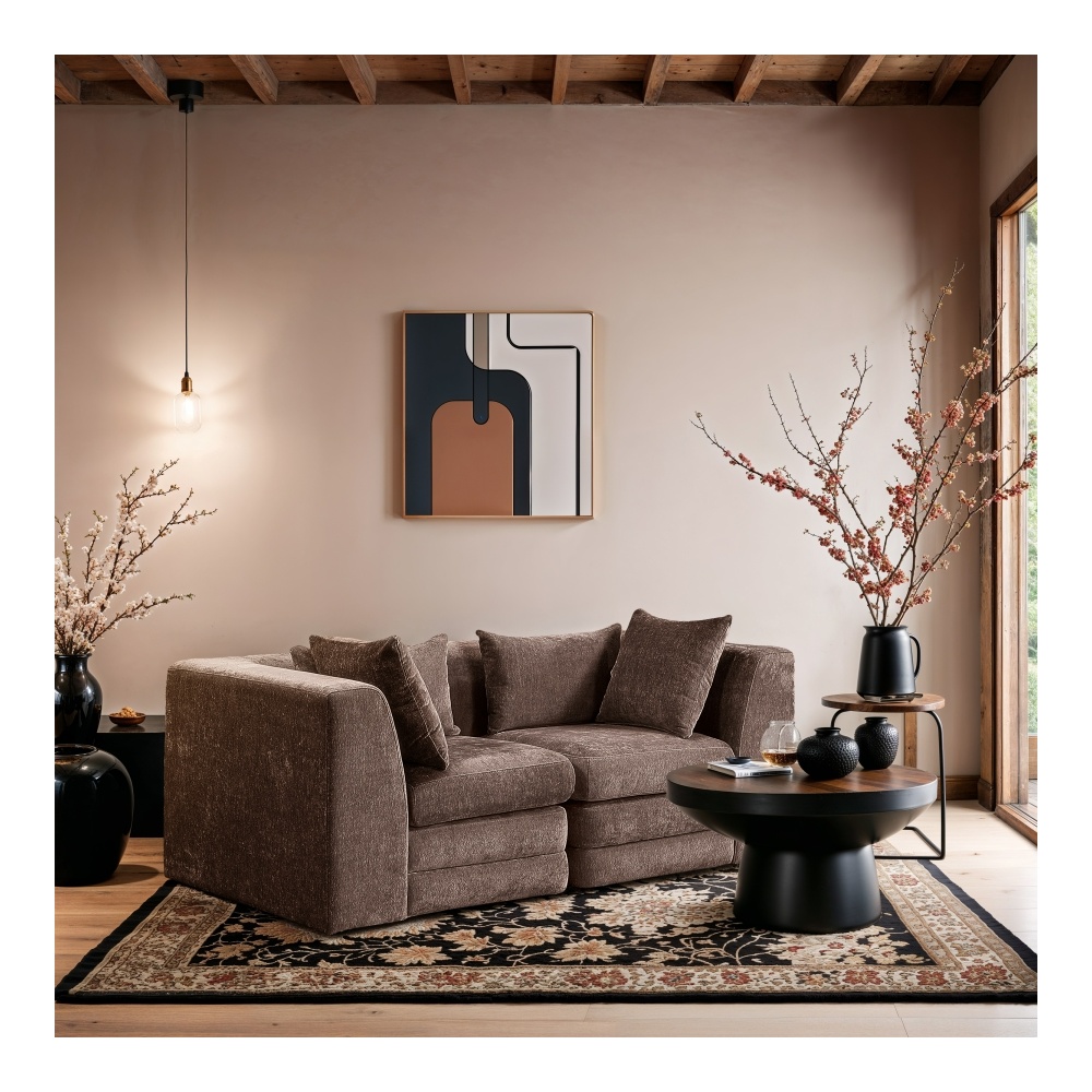Plush brown chenille and a sprawling modular design make the Stellar loveseat a standout for cozy, contemporary living. Crafted with a solid wood inner frame and 570 GSM fabric, it’s built for both durability and style. Configure and reconfigure the set to suit any space, effortlessly connecting each section with hidden latches underneath.